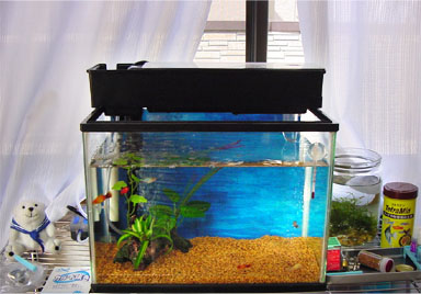 2003/7/29![]() 窓辺の涼しげな水槽です。レイアウトもシンプルで魚が見やすいです。 バックスクリーンは手書きだそうで、手作りの感じが良く出ている水槽です。 提供:☆ヤシガニ☆さん |
