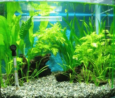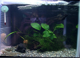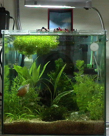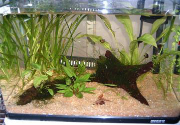 2003/5/18![]() 30センチキューブ水槽の水景です。水槽の上にローチのぼりが置いてあるの見えますか? 提供:haruruさん |