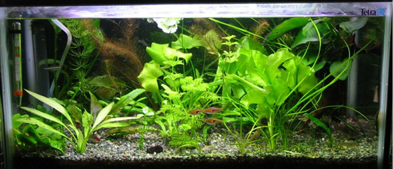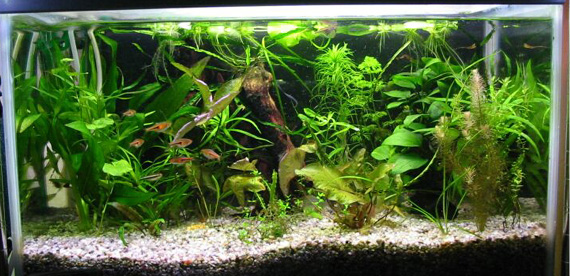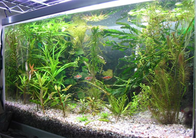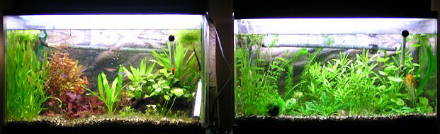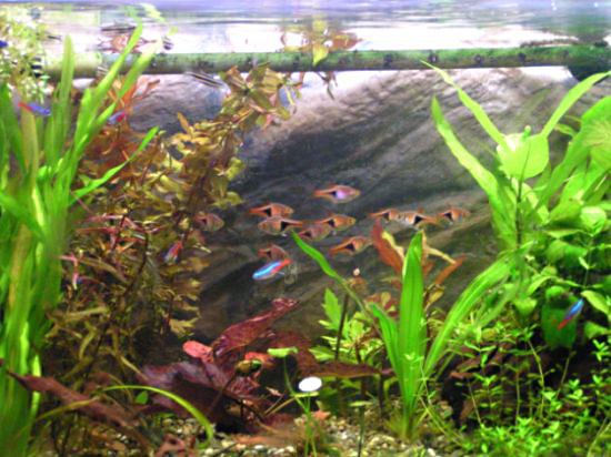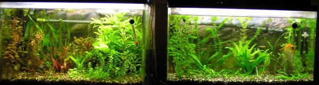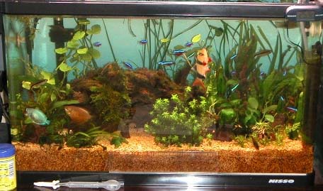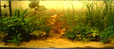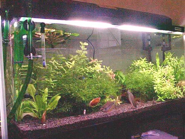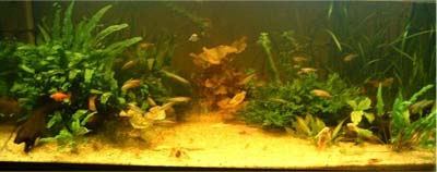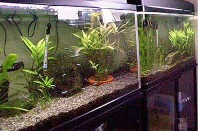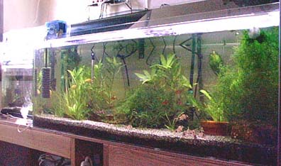 2003/8/12![]() ![]() 上から第1水槽、第2水槽だそうです。きれいな水草がいっぱいです。 発酵式の二酸化炭素添加をしているそうです。ラスボラエスペイが良く映えてます。 提供:ゆきねこさん |