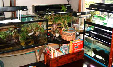 2003/8/1![]() ![]() ![]() かすぴさんの家の水槽群です。まるでお店のような品揃えです。 上二枚が居間の様子、下の一枚が使われていないお風呂場だそうです。 お風呂場みたいな排水の楽なところに一度で良いから水槽を置いてみたいものです。 提供:かすぴさん |