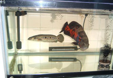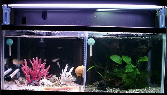 2003/10/6![]() ![]() ![]() 新しく作られた60センチ水槽だそうです。二つに分けて、 左を海中、右を湖中というコンセプトでレイアウトされています。 一つの水槽に二つの世界があるのはなんだか不思議な気がします。 提供:しゅうさん |