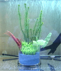 2003/9/21![]() 120センチの水槽に、たくさんの大型魚が泳いでおります。 その一番下の方にローチがこっそりと居るのが見えますね。 ちょっとスリリングな混泳ですが、彩りと迫力のある水景です。 ![]() この水槽の中にある鉢植えです。実はダミーだそうですが、 大型魚は水草を食べてしまうための処置だそうです。 提供:しゅうさん |
