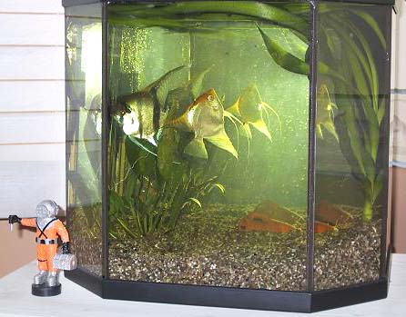 2003/6/19![]() エンゼルカップルのための背の高い水槽です。ゴールデンエンゼルはなぜ上を向いているのでしょうか? 手前の人形、結構好きです。 提供:佐和子さん |