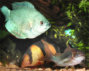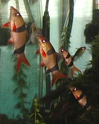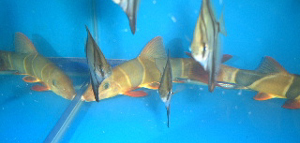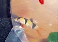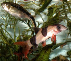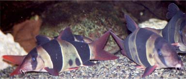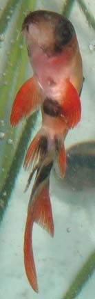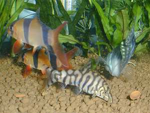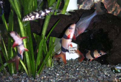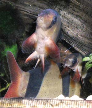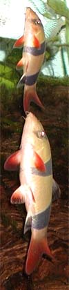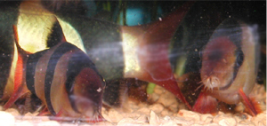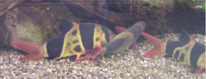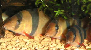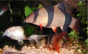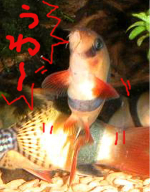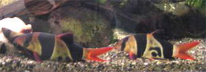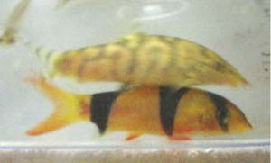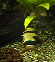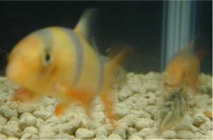 2003/11/24![]() クラウンローチ2匹とパキスタンローチのちくわんのショットです。 どちらも立派に育っています。縞も綺麗に出てきましたし、仲が良さそうで良かったです。 提供:あゆみさん |