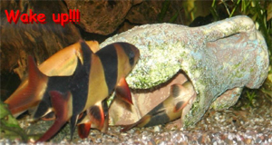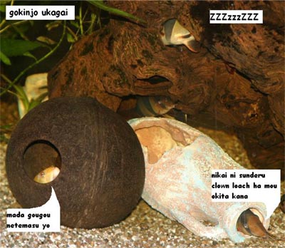2004/3/10![]() 佐和子さんとアランさんの水槽の風景です。 クラウンローチとアルジイーターそれぞれのお気に入りの家に入って満足げな図です。 それにアランさんがつけてくださった吹き出しも楽しいですね。 やっぱりローチって、自然に言葉をつけたくなりますね(^^; 提供:アランさん |