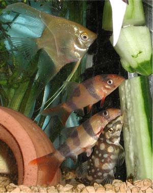 2004/4/28![]() キュウリを狙うクラウンローチの図です。なんでも食べますから、本当に良い魚です(^^) そして、エンゼルと、アンジェリカスボティアまで仲良く写っています。 提供:梓尤稀さん |