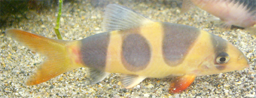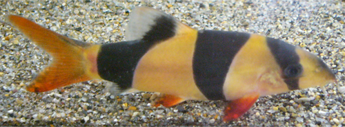 | ●名前:腹丸くん ●飼い主:猫丸 ●体長:約7センチ ●親バカアピールポイント:最近なぜかあまり成長しなくなった腹丸くんですが、うちに居る中では群を抜いて美ローチだと思っています。今まで飼ったなかでもかなりの上位かと。体型が太すぎず細すぎず、尾鰭の伸び具合も丁度良くて、うちでは一番格好がよいです。何よりも、縞の黒や各ヒレのオレンジが鮮やかで、皮膚の色との境目がくっきりはっきりしていところがお気に入りです。 ●掲載日:2003/12/13 |