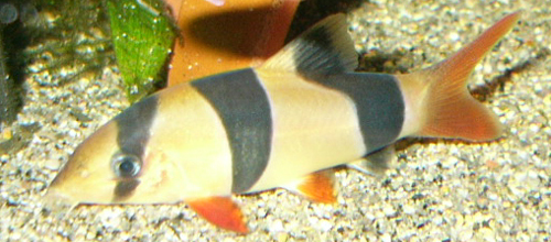 | ●名前:4ちゃん ●飼い主:猫丸 ●体長:約8センチ ●親バカアピールポイント:一番新顔なのにやたらと成長して、ついに最近うちの最大ローチになってしまいました。4ちゃんの魅力はなんといっても、この4本の縞です。ちょっと縞の色が薄く、境目も不明瞭なのが残念ですけど、この強烈な個性はそんなことを補ってあまりあると思います。それと、背鰭がほとんど透明というのも密かに自慢だったりします。ただ、最近ちょっと太り気味なのが気になるところです。 ●掲載日:2003/12/13 |